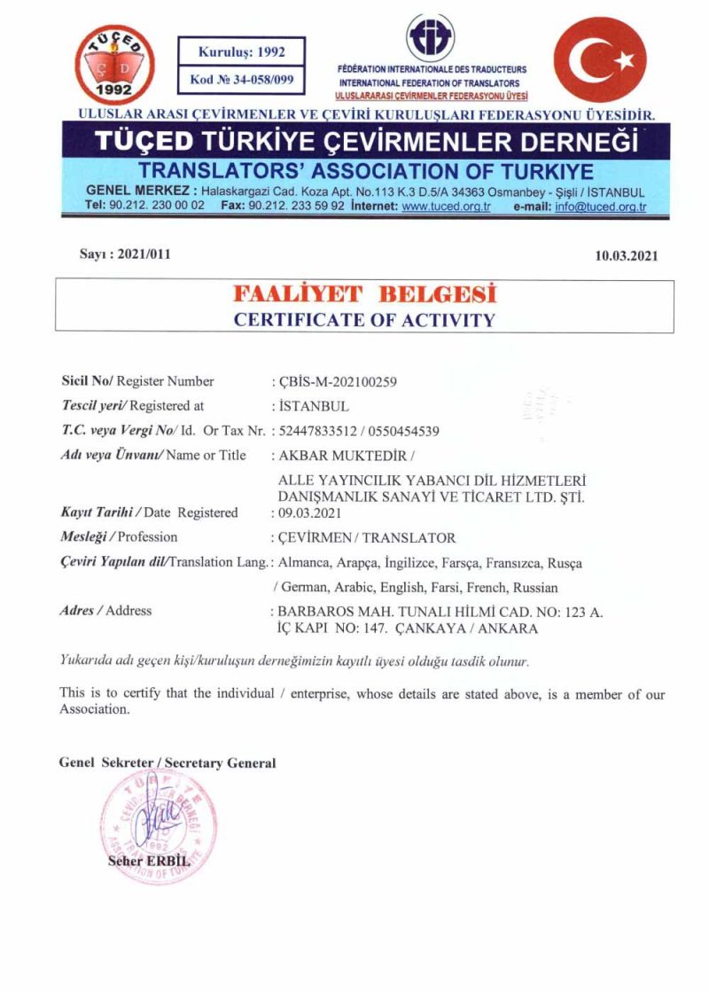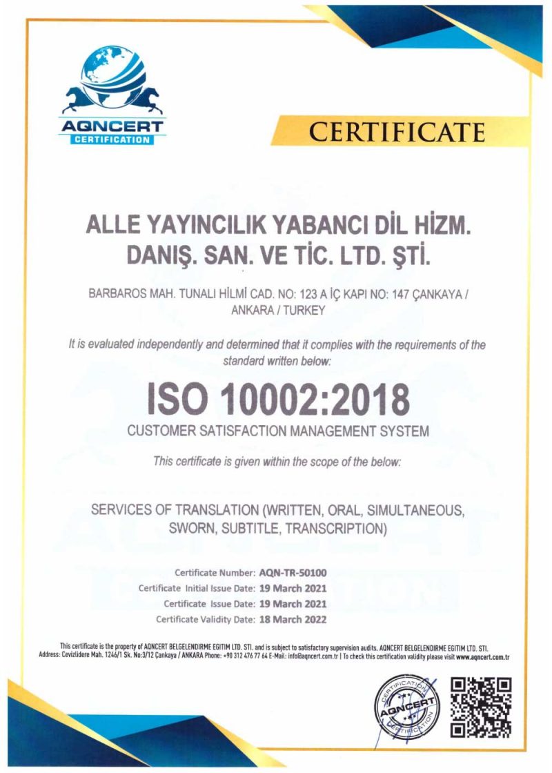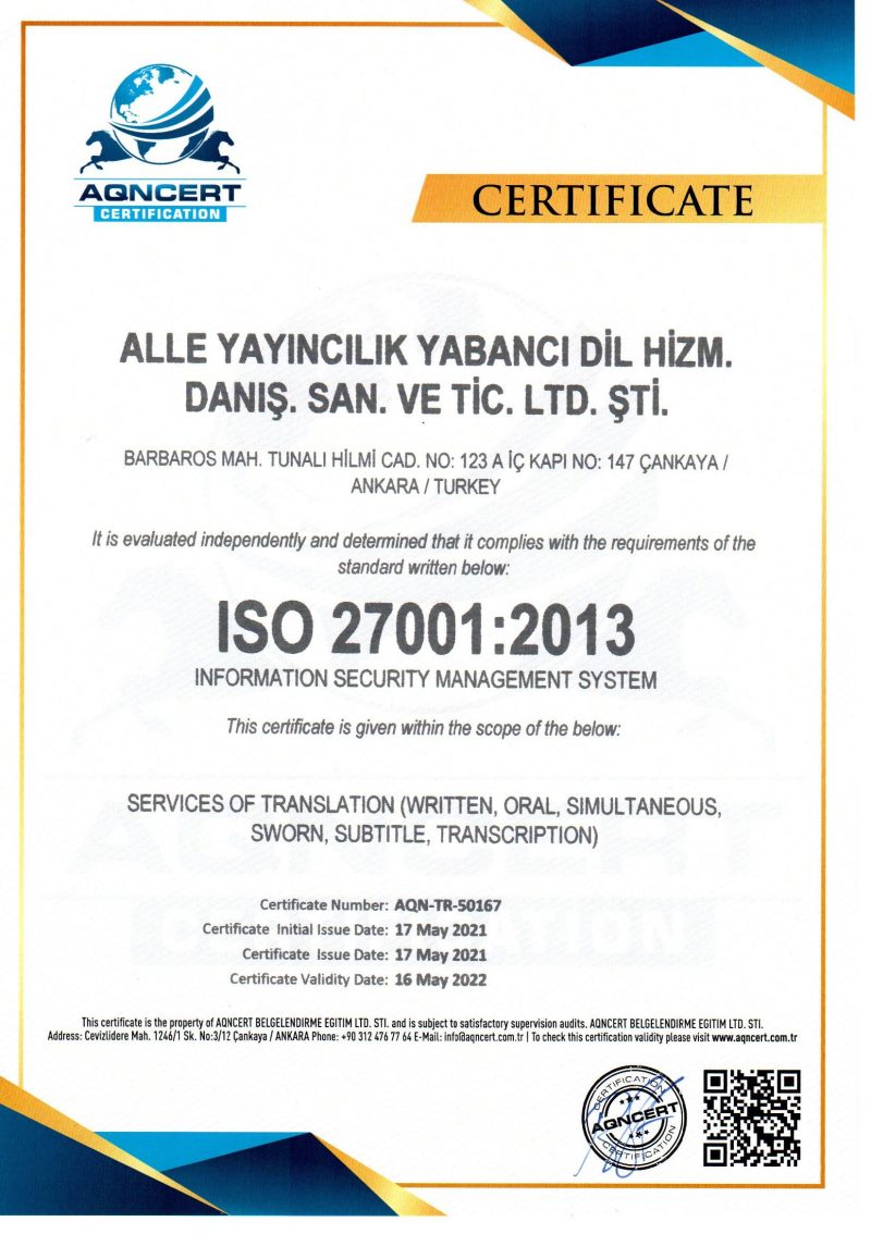 Alle Yayıncılık Yabancı Dil Hizmetleri Danışmanlık Sanayi ve Ticaret Limited Şirketi, 2012 yılında Ankara’da kurularak “Alle Tercüme Bürosu” markası altında çeviri sektöründe faaliyetlerine başlamıştır.